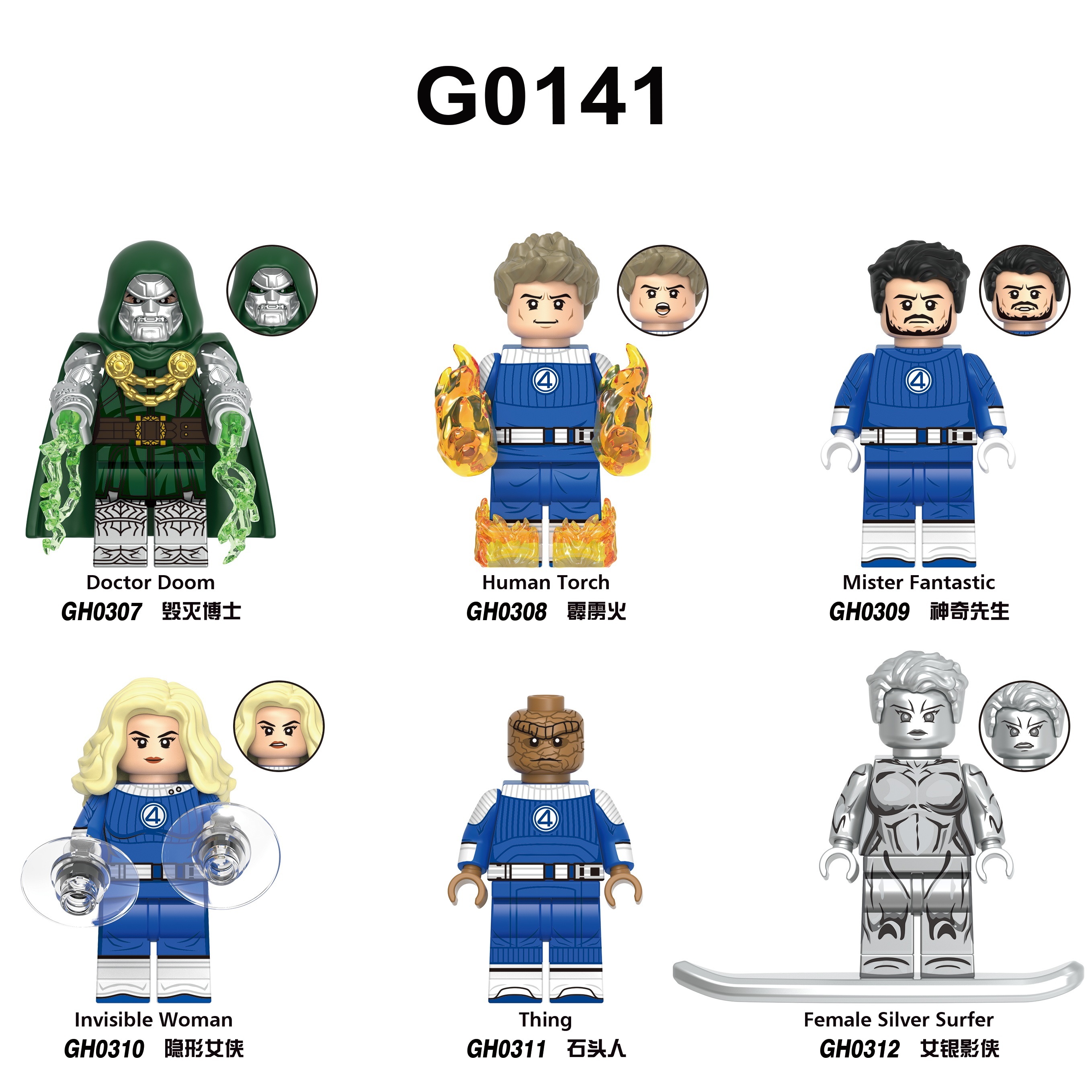 G0141 GH0307 GH0308 GH0309 GH0310 GH0311 GH0312 Super Heroes Thing Invisible Woman Doctor Doom Human Torch Mister Fanstastic Female Silver Surfer Building Blocks Action Figures Toys For Kids