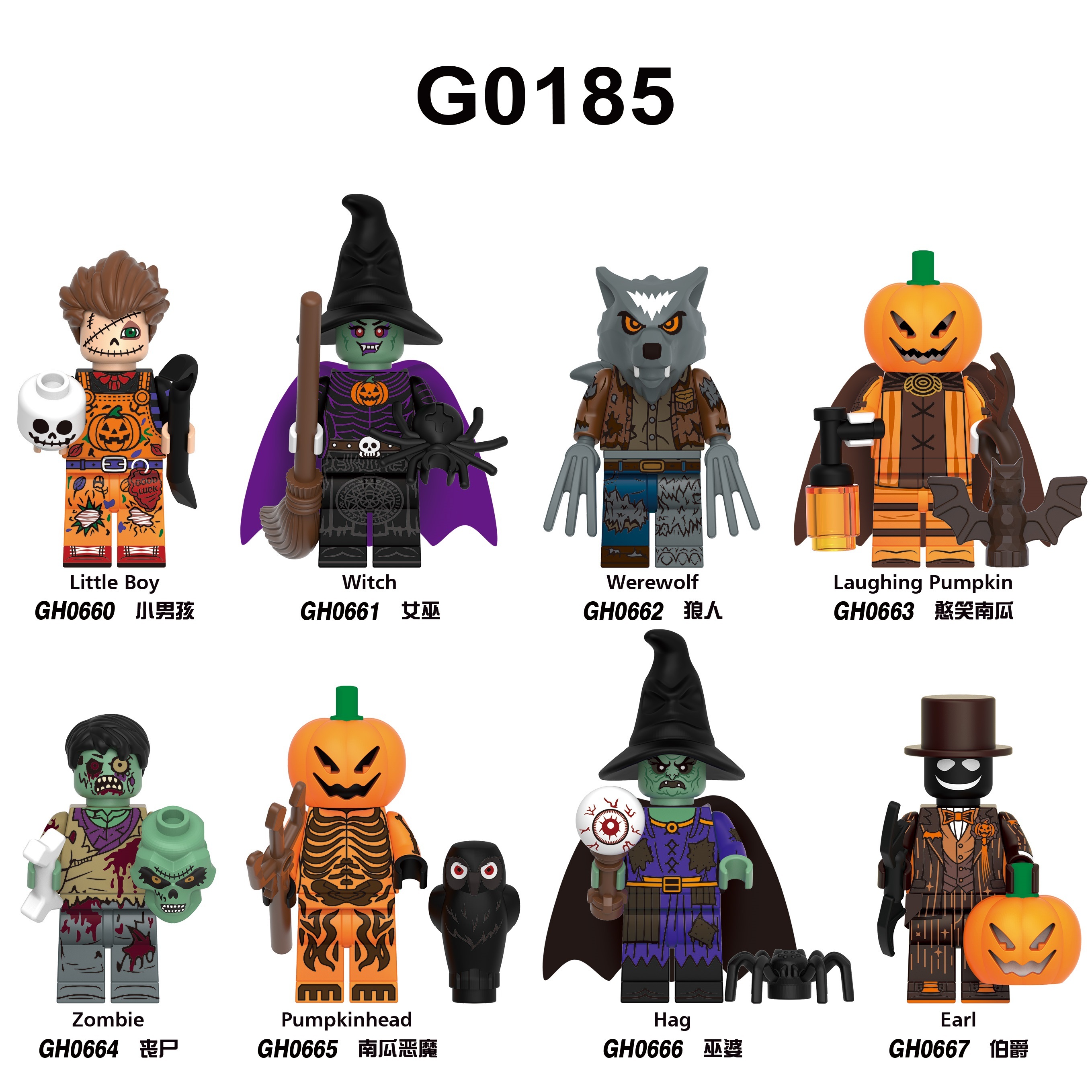 G0185 GH0660 GH0661 GH0662 GH0663 GH0664 GH0665 GH0666 GH0667 Halloween Horror Little Boy Witch Werewolf Laughing Pumpkin Zombie Pumpkinhead Earl Hag Building Blocks Action Figures Educational Toys For Kids