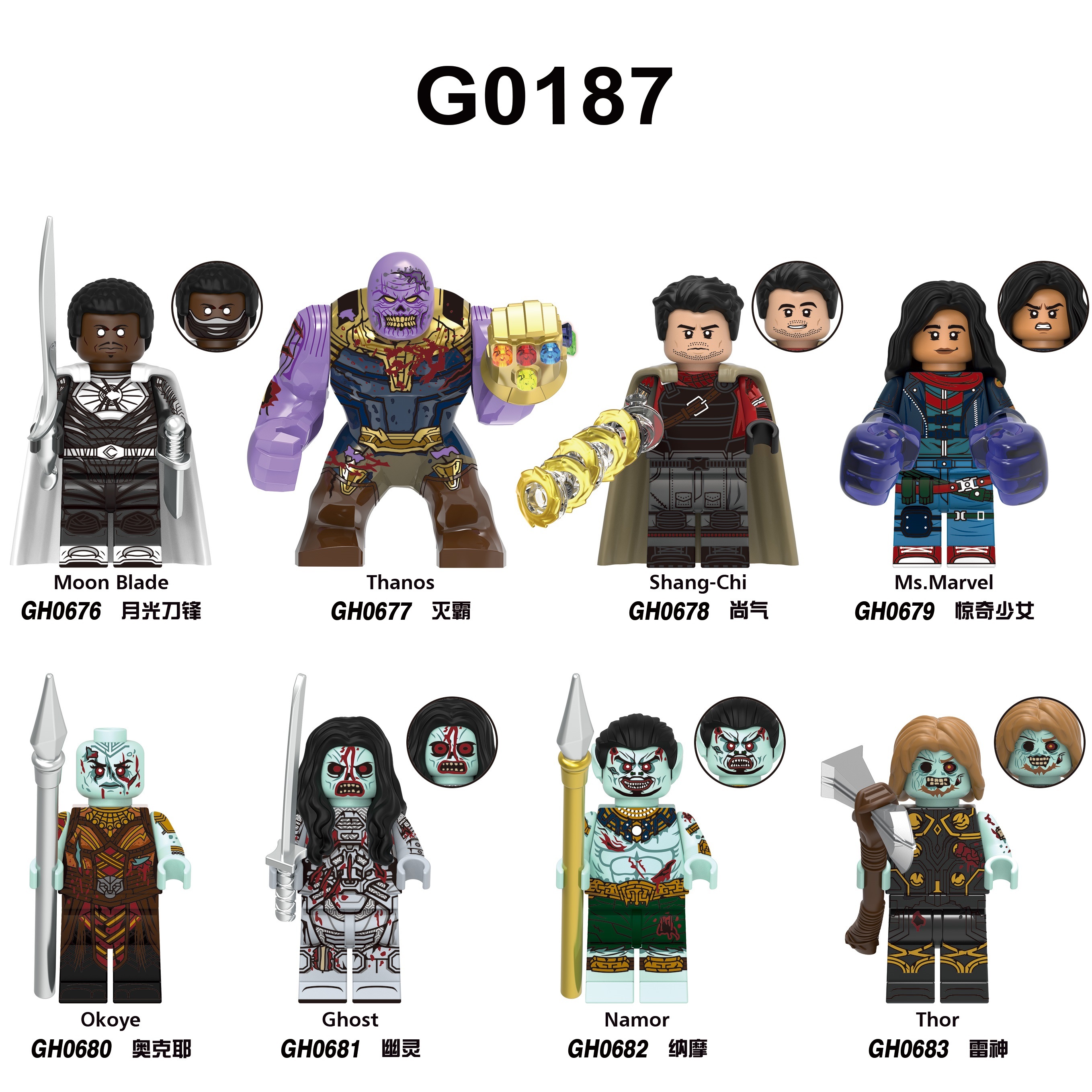 G0187 GH0676 GH0677 GH0678 GH0679 GH0680 GH0681 GH0682 GH0683 Zombie Super Heroes Ghost Namor Ms. Marvel Thanos Shang-Chi Thor Moon Blade Okoye Building Blocks Action Figures Educational Toys For Kids